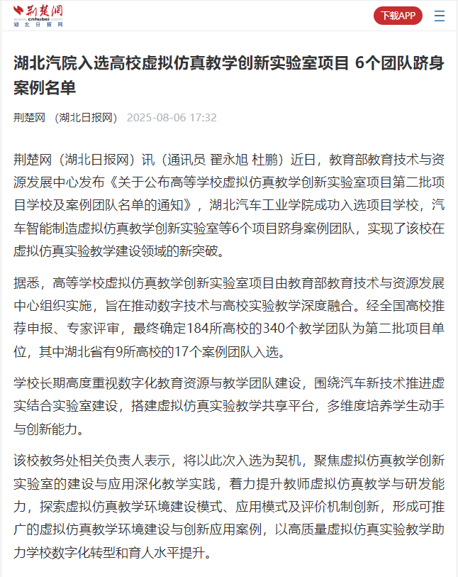 【荆楚网】湖北汽院入选高校虚拟仿真教学创新实验室项目 6个团队跻身案例名单